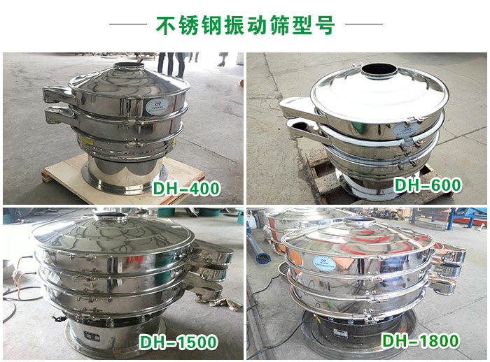 不銹鋼振動篩型號齊全,型號有DH400、DH600、DH800、DH1000、DH12000、DH1500、DH18000等,可滿足客戶對于玉米粉產(chǎn)量的不同需求,平均篩分產(chǎn)量為時篩10噸左右!